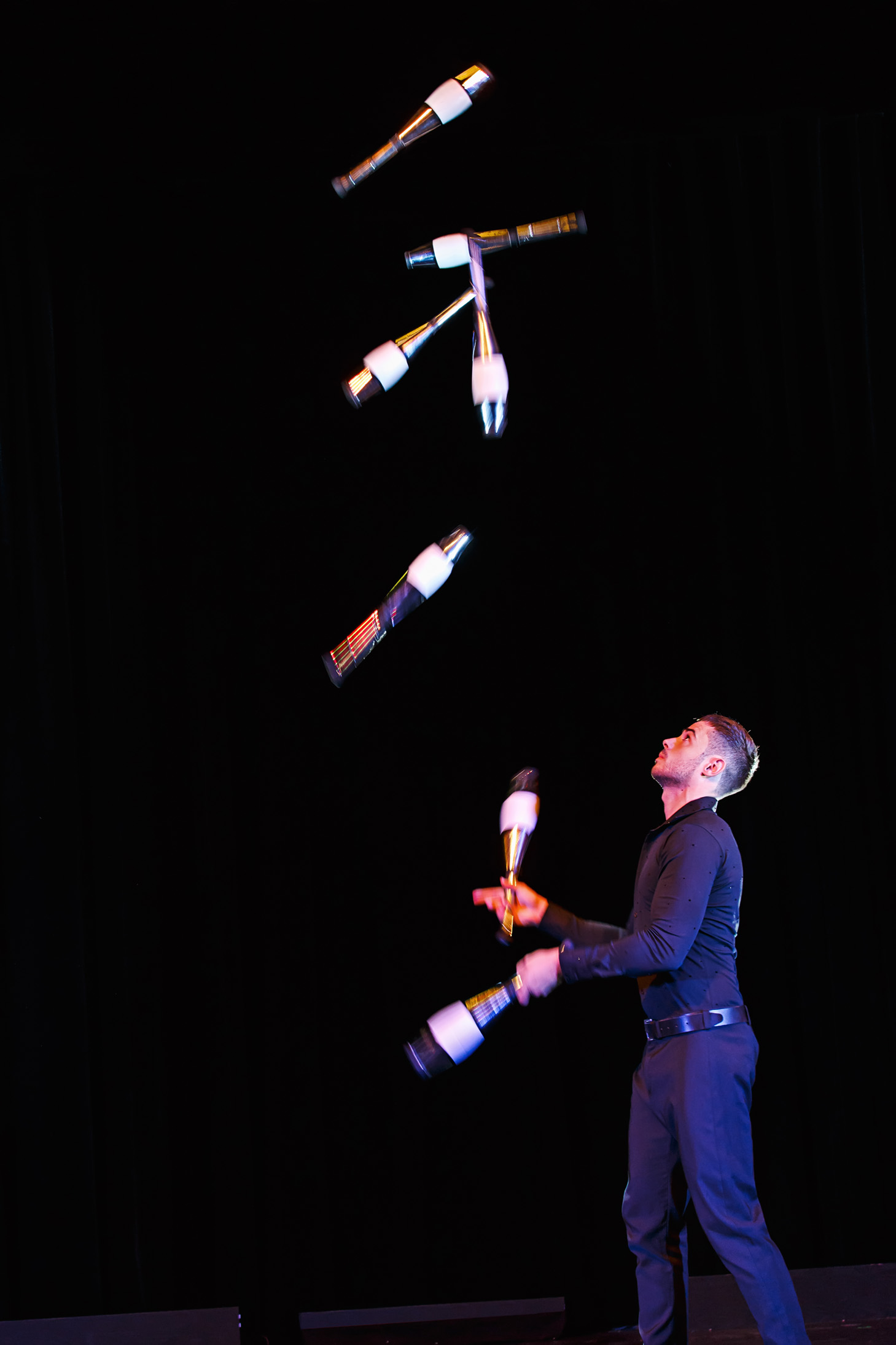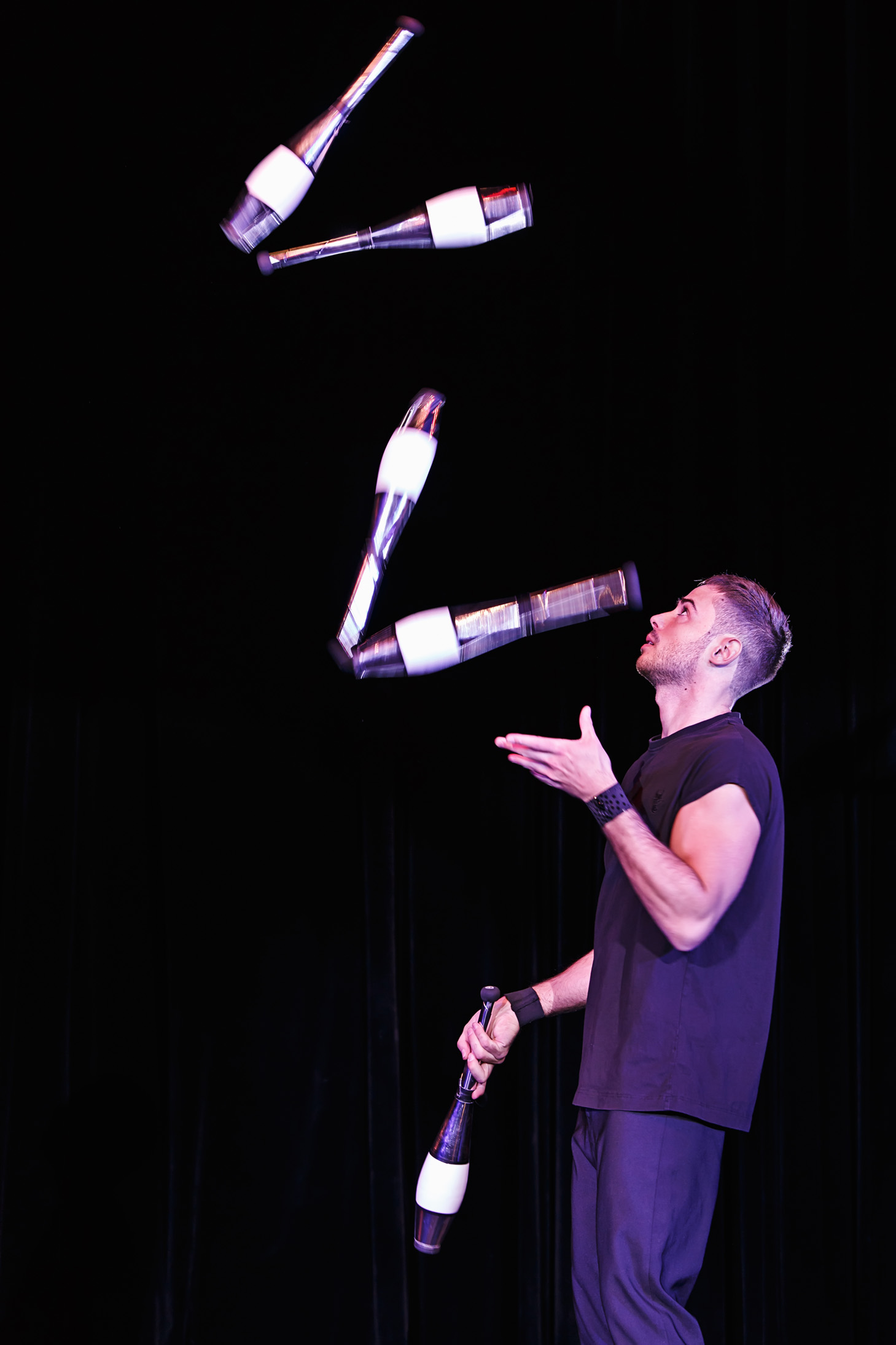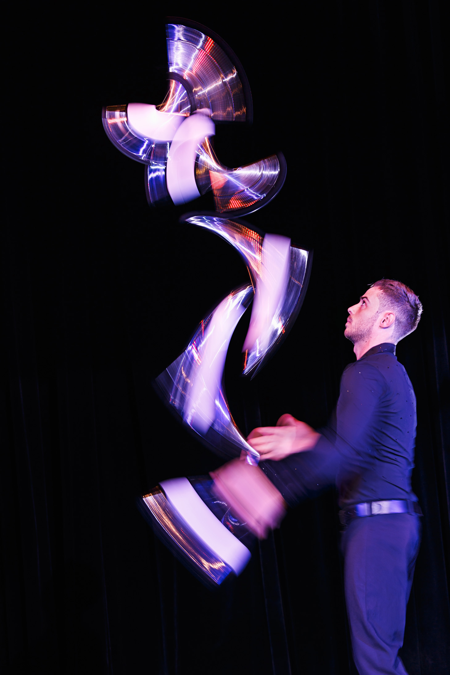 Seine Hochgeschwindigkeits-Jonglage verbindet klassische Requisiten mit moderner Inszenierung und macht jede Performance zu einem visuellen Erlebnis der Extraklasse.