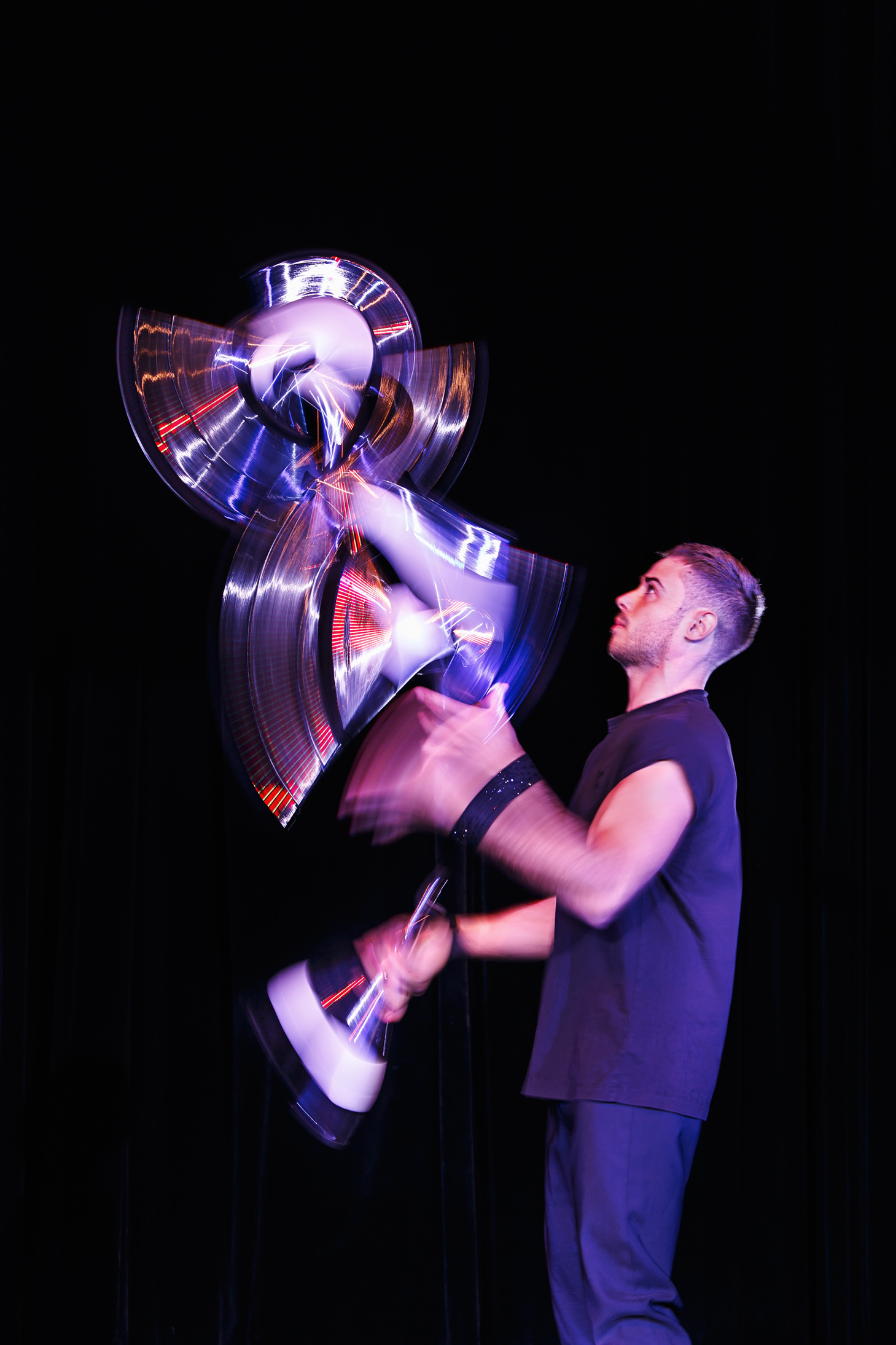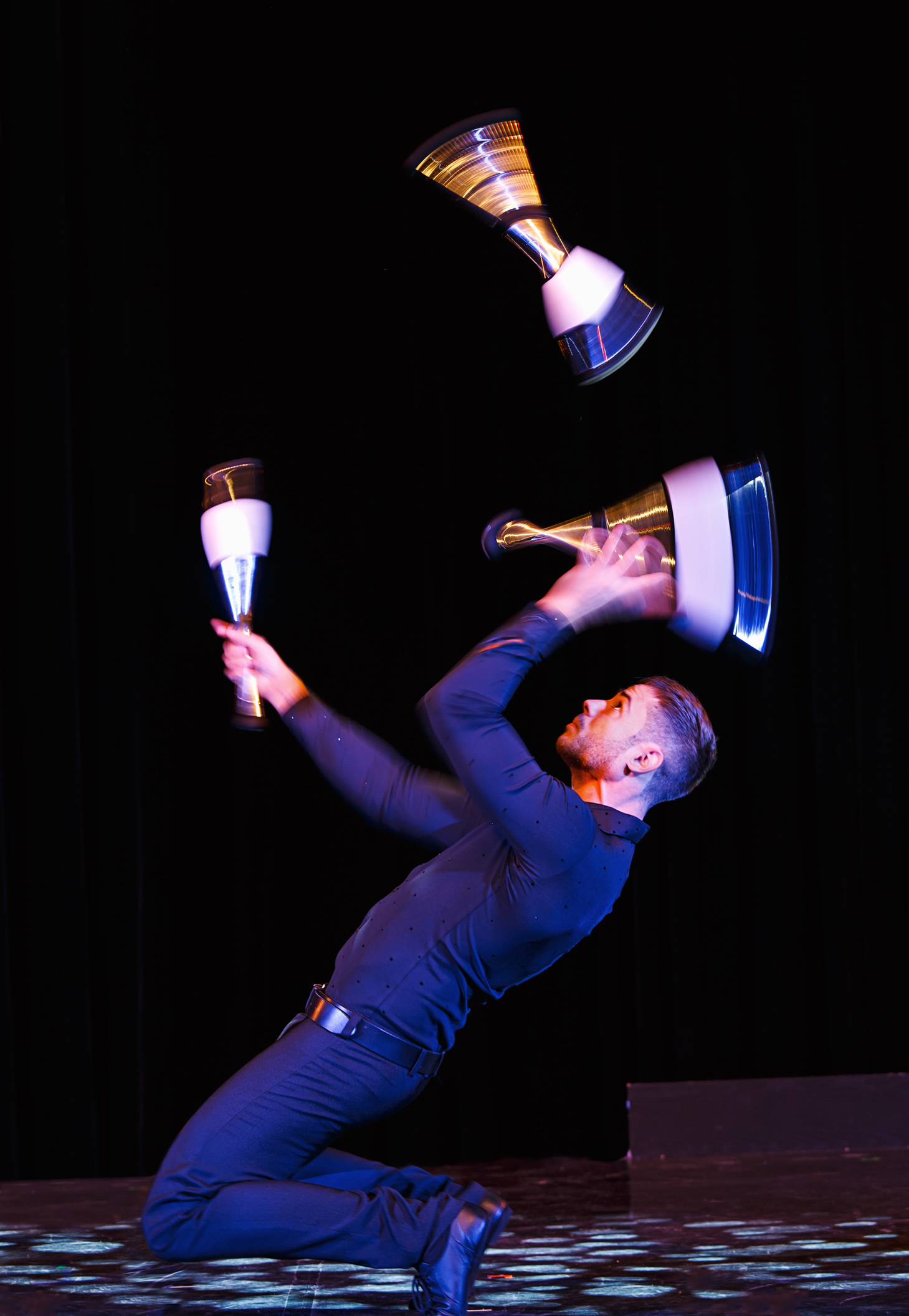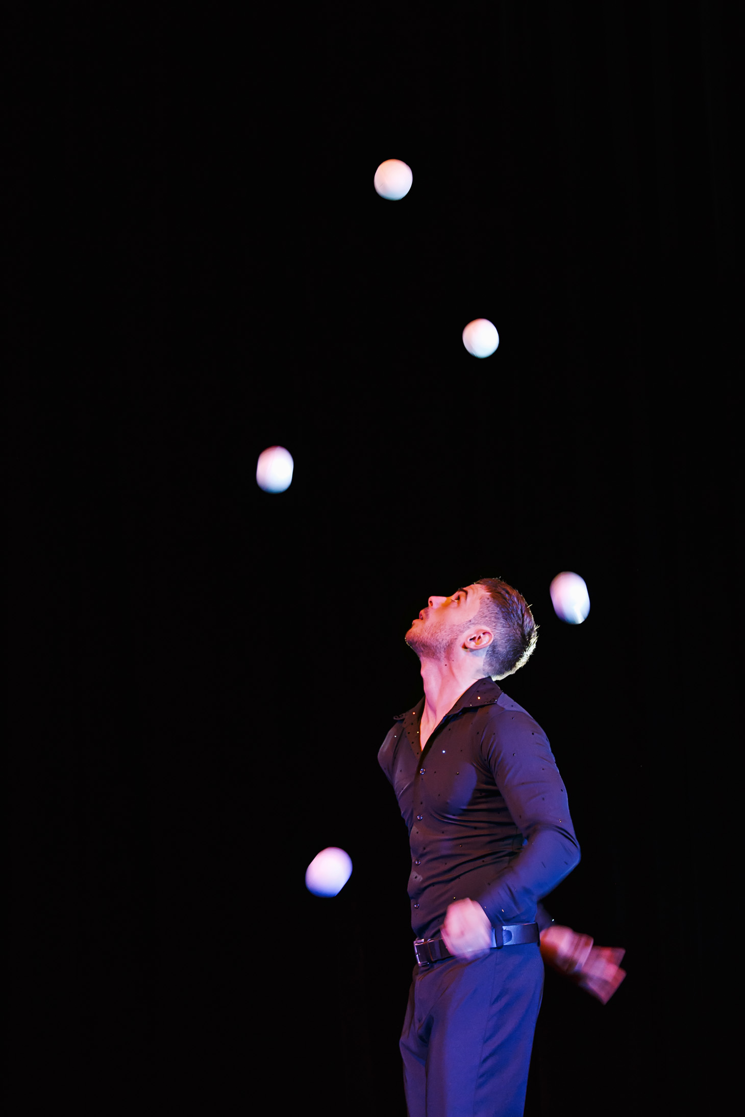 Seine Hochgeschwindigkeits-Jonglage verbindet klassische Requisiten mit moderner Inszenierung und macht jede Performance zu einem visuellen Erlebnis der Extraklasse.