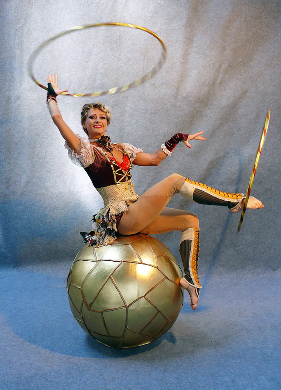 Inspiriert von der Tradition klassischer Circus-Artisten, zeigt diese Darbietung pure Eleganz und akrobatisches Können. Mit perfekter Balance auf dem Ball und fließenden Hula-Hoop-Bewegungen wird jede Bühne zum Blickfang. Dauer: ca. 5:30 Minuten. - Exzentrische Variante „Hula-Hoop Opernball“